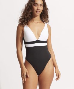 Seafolly Ladies Women’s Swimwear Slice Of Splice Deep V Neck One Piece – White
